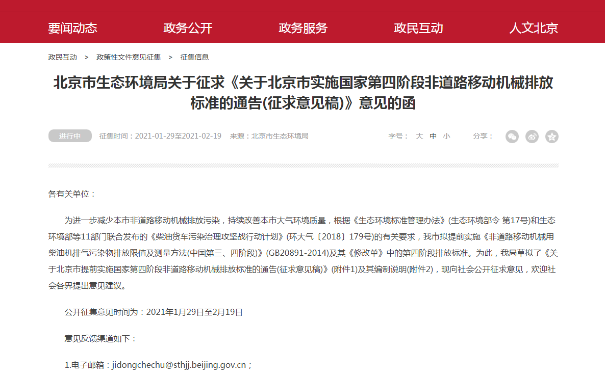 北京擬于2021年12月1日提前實施國家非道路國四排放標準
